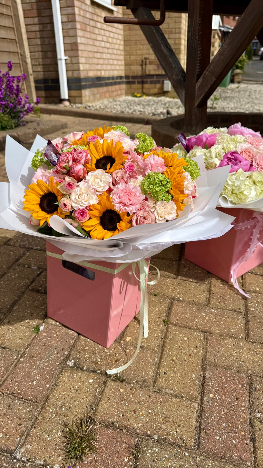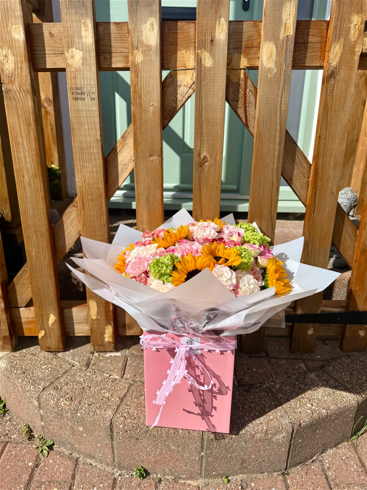A radiant blend of warmth and romance, this bouquet features vibrant sunflowers paired beautifully with delicate pink spray roses, soft ruffled carnations, and fresh green snowball blooms. The combination creates a stunning contrast of bold golden tones and gentle blush hues, perfect for brightening any occasion.