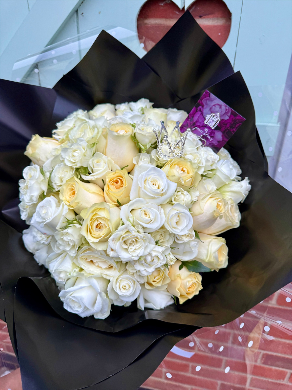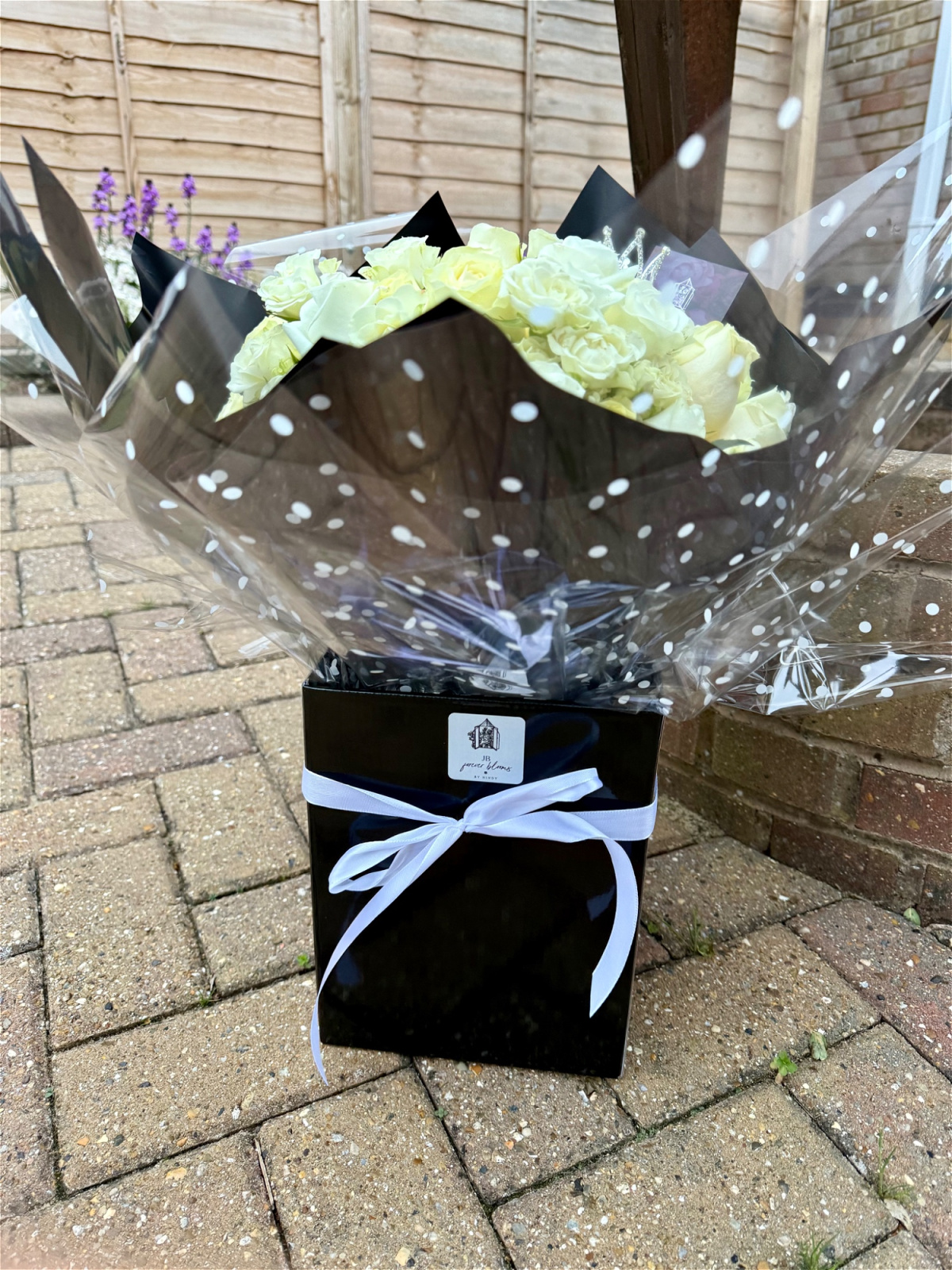 A stunning hand-tied arrangement featuring beautiful cream and white roses, delicate buttercups, and charming spray roses. This bouquet is elegantly aqua-packed for freshness and presented in a stylish box, finished with a luxurious silk bow perfect for gifting or special occasions.