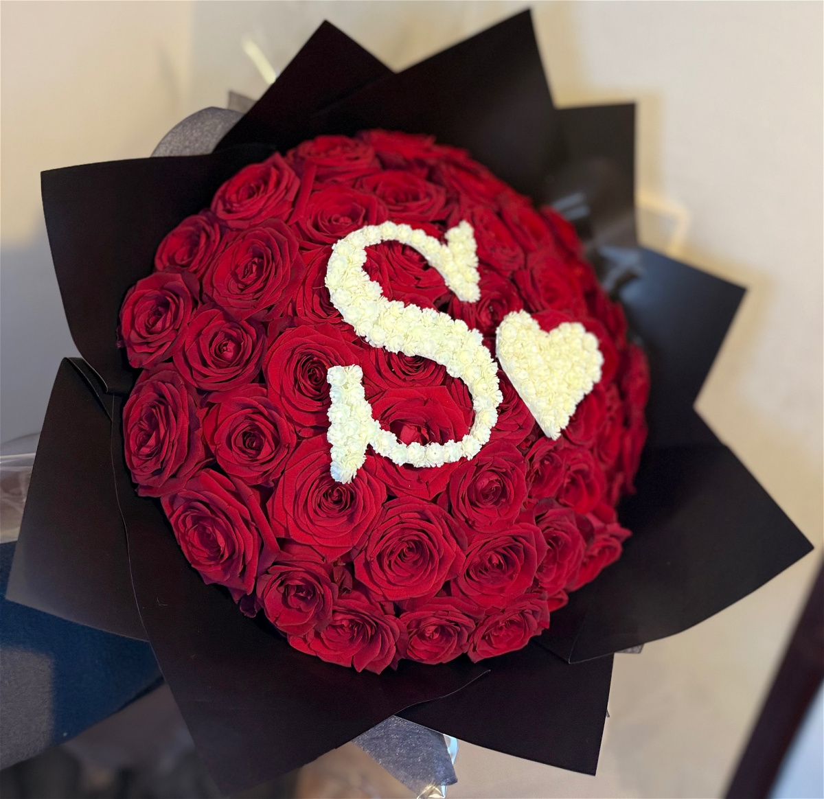 This Roses Bouquet is a true show-stopper. Lush roses form the base, while silk baby’s breath is expertly shaped into a personalized initial and a heart, resting delicately on top. Wrapped in sleek black paper and presented aqua packed and a box, it’s a modern, romantic statement that wows at first sight.